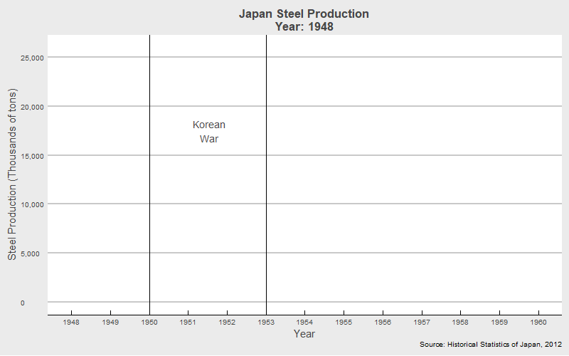 (NOTE: I originally used data from Statistical Abstract of the United States (editions between 1950 and 1960), in process of writing this article I tried to find more data from before 1950 and came across the Historical Statistics of Japan (by the Japan Statistical Association) that has the crude steel production from 1948 to 2004. Although the Statistical Abstract data matched up well with the Japanese source I elected to recreate this graph from the Historical Statistics of Japan data instead.)