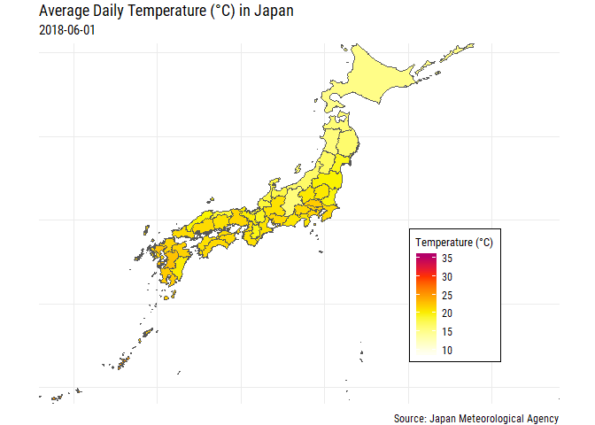 labs(title = glue::glue("Average Daily Temperature (°C) in Japan"),