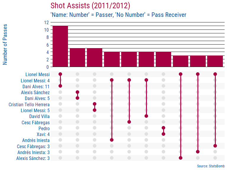As can be seen above a little more work needs to be done concerning the axis-labels. Although Messi is labelled having made 7 passes, they are 7 passes EACH to Alexis Sanchez, Iniesta, Cristian Tello, and Dani Alves so the total really should read as 28.
